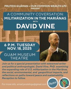 Join us for a special presentation with esteemed writer and political anthropologist, David Vine, PhD. examining the expanding role of U.S. militarization in the Marianas, the social, environmental, and geopolitical impacts, and reflections on paths toward peace and sustainability.